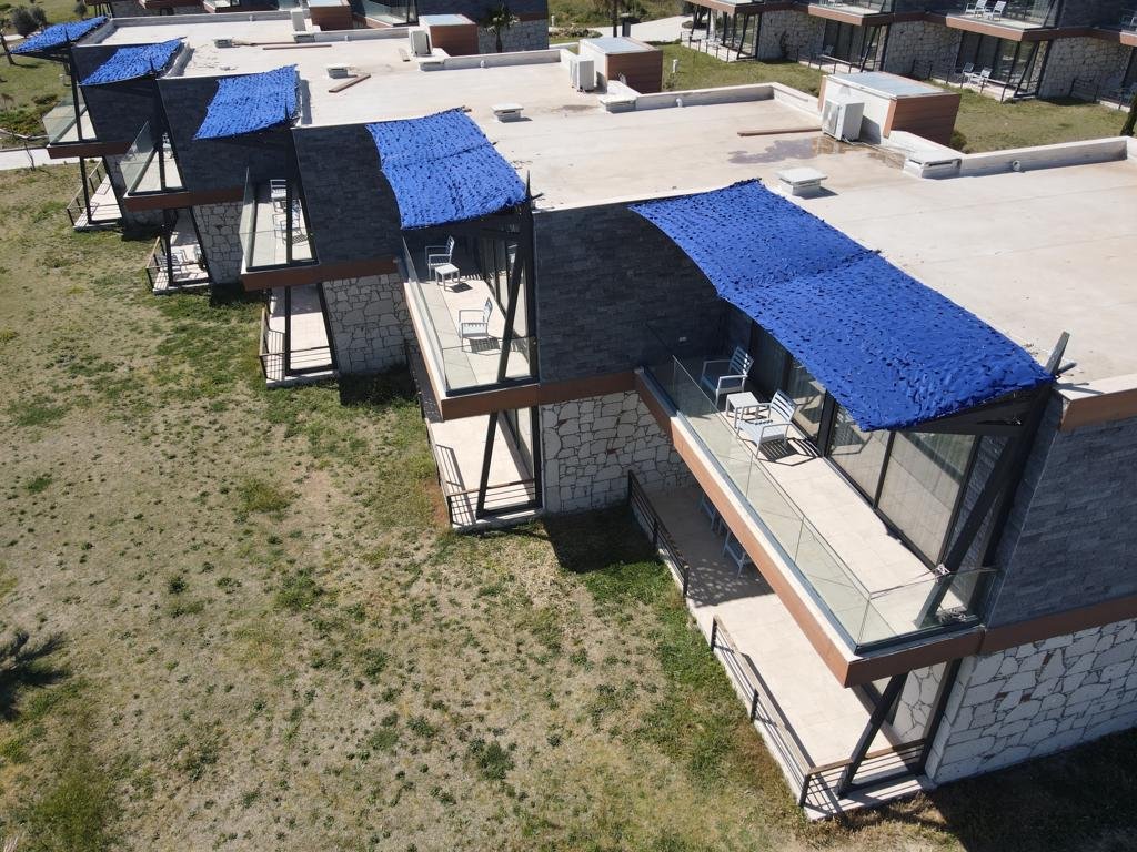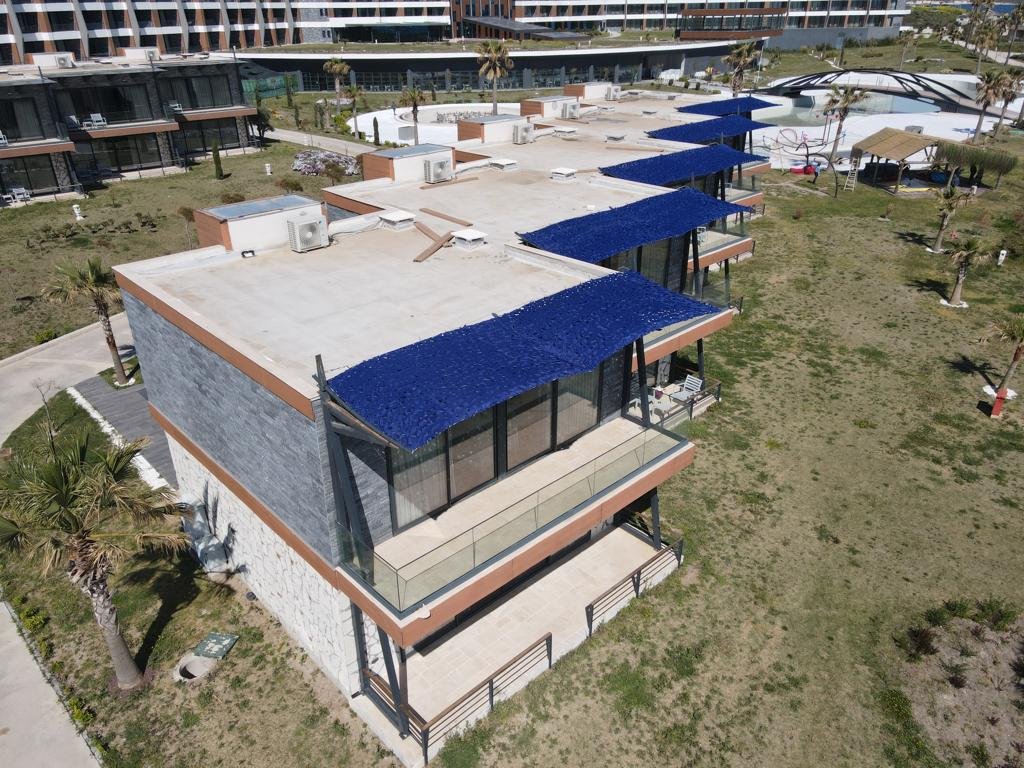 Alaçatı Zigana Otel’in dış mekân konforunu artırmak için özel üretim spider gölgelik sistemleri ile gölgelendirme çözümleri sağladık. Havuz başı dinlenme alanlarında ve açık oturma bölümlerinde uygulanan yaprak desenli tente sistemleri, hem doğal gölge sağladı hem de otelin estetik yapısına uyumlu bir atmosfer oluşturdu.