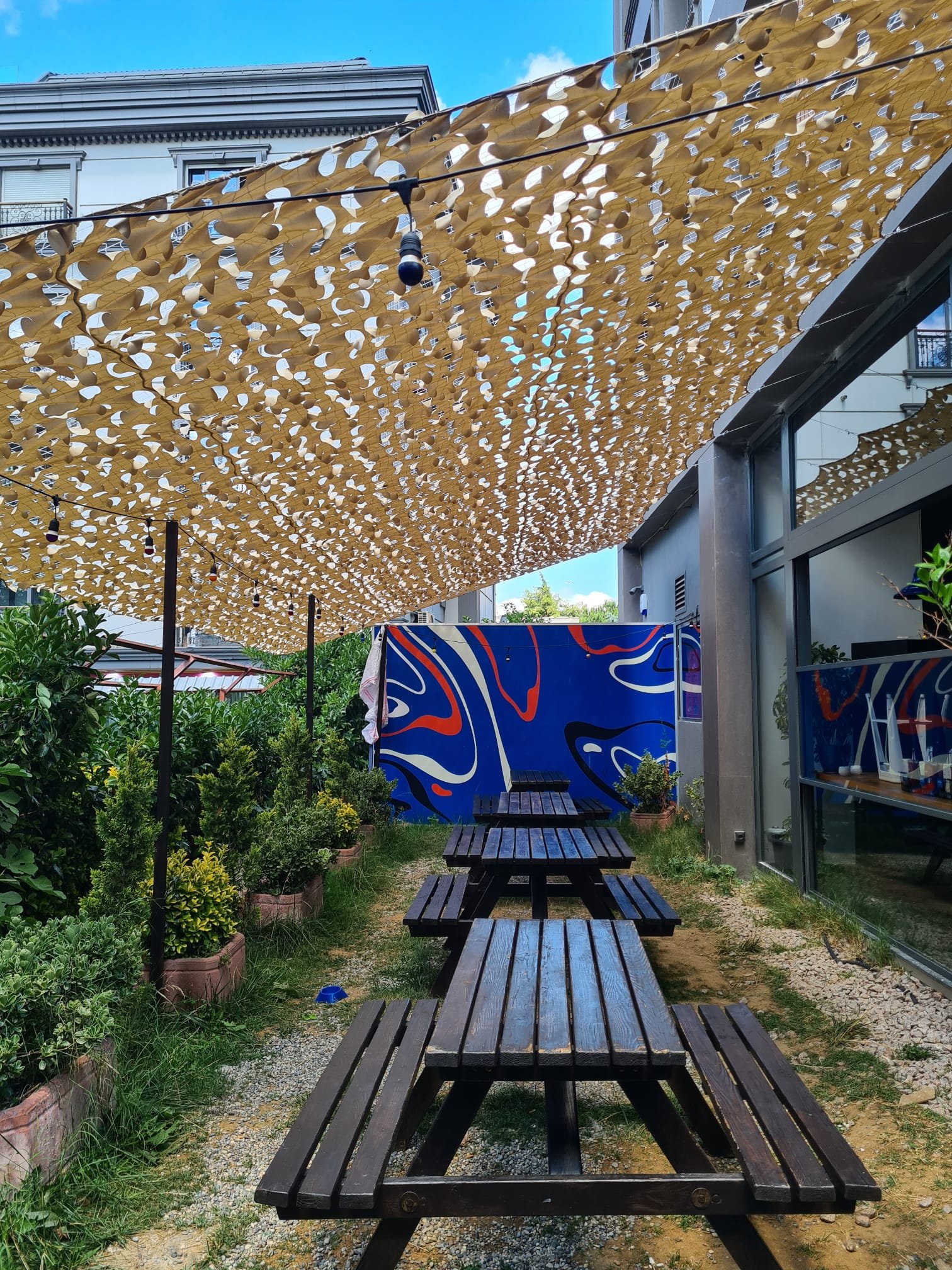 Banko Burger’in açık alanlarını daha konforlu hâle getirmek, güneşten korunma sağlamak ve mekâna estetik bir dokunuş katmak için özel üretim spider gölgelik sistemleri kurulumu gerçekleştirdik. Yaprak desenli, UV dayanımlı kumaşla tasarlanan bu sistem, açık oturma bölümlerinde doğal bir gölge oluşturarak müşteri memnuniyetini artırdı.